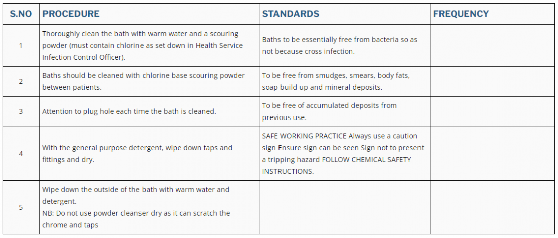 2 | Baths should be cleaned with chlorine base scouring powder between patients. | To be free from smudges, smears, body fats, soap build up and mineral deposits. | |
