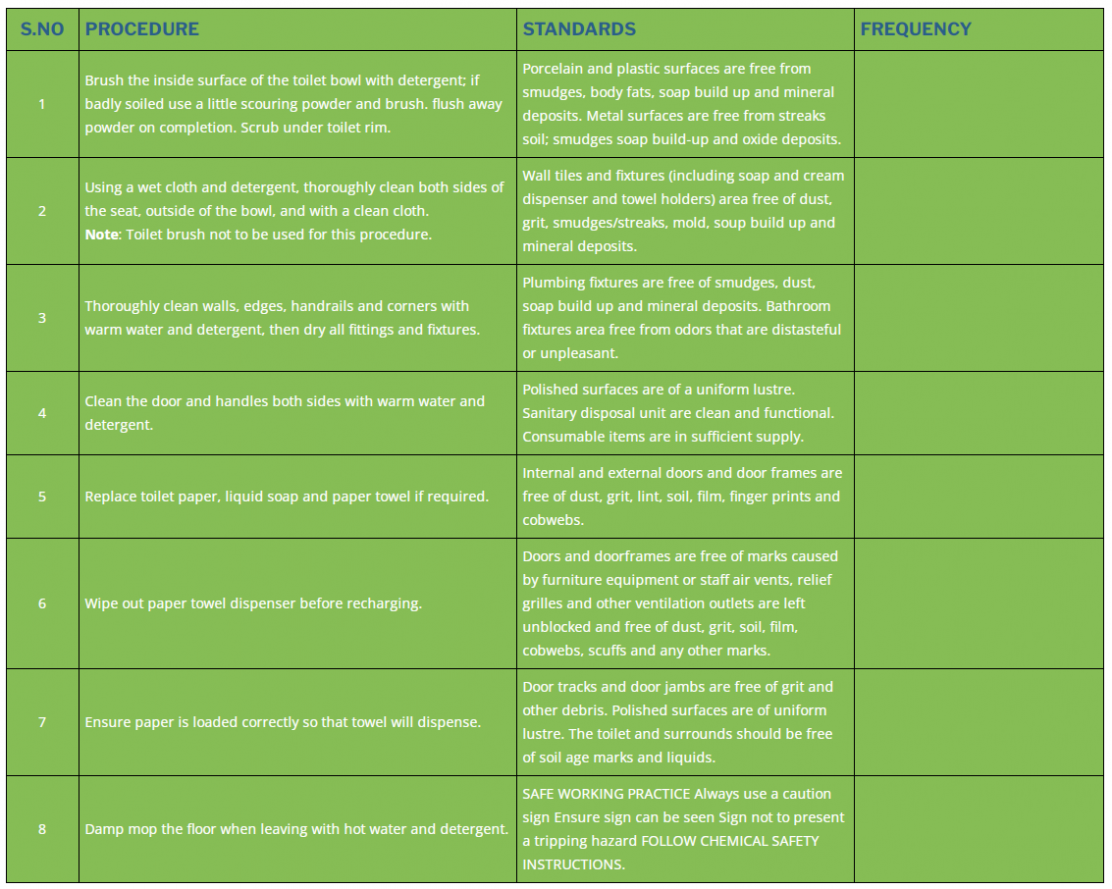 5 | Replace toilet paper, liquid soap and paper towel if required. | Internal and external doors and door frames are free of dust, grit, lint, soil, film, finger prints and cobwebs. | |