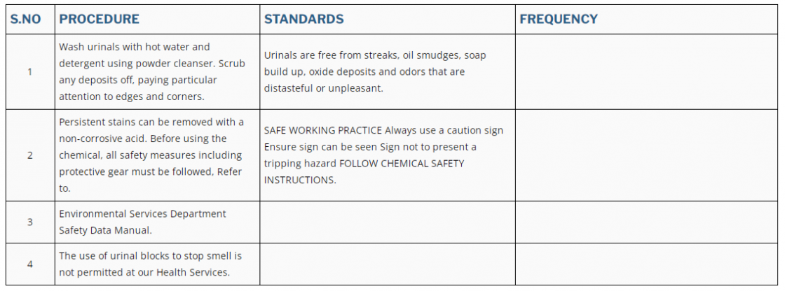 1 | Wash urinals with hot water and detergent using powder cleanser. Scrub any deposits off, paying particular attention to edges and corners. | Urinals are free from streaks, oil smudges, soap build up, oxide deposits and odors that are distasteful or unpleasant. | |