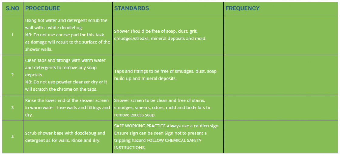 1 | Using hot water and detergent scrub the wall with a white doodlebug. NB: Do not use course pad for this task, as damage will result to the surface of the shower walls. | Shower should be free of soap, dust, grit, smudges/streaks, mineral deposits and mold. | |