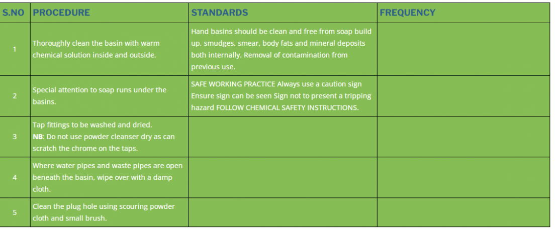 1 | Thoroughly clean the basin with warm chemical solution inside and outside. | Hand basins should be clean and free from soap build up, smudges, smear, body fats and mineral deposits both internally. Removal of contamination from previous use. | |