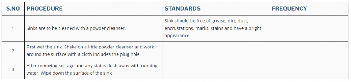 1 | Sinks are to be cleaned with a powder cleanser. | Sink should be free of grease, dirt, dust, encrustations, marks, stains and have a bright appearance. | |