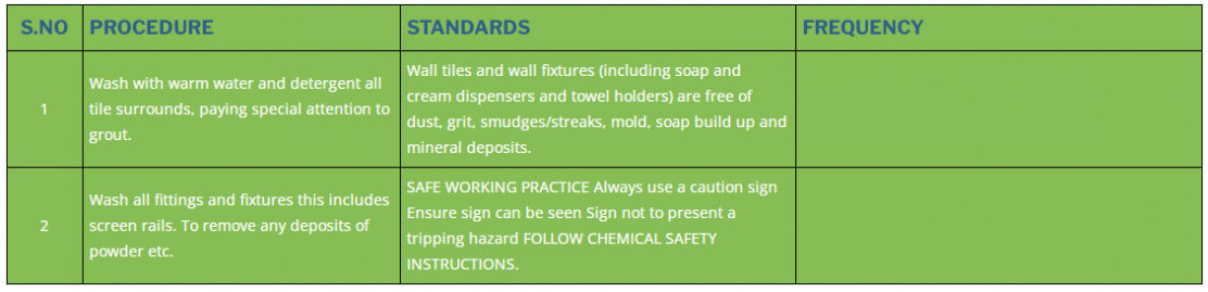 1 | Wash with warm water and detergent all tile surrounds, paying special attention to grout. | Wall tiles and wall fixtures (including soap and cream dispensers and towel holders) are free of dust, grit, smudges/streaks, mold, soap build up and mineral deposits. | |