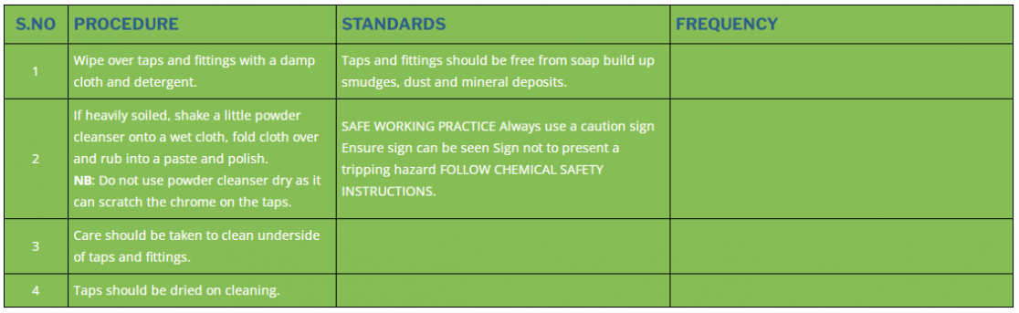 1 | Wipe over taps and fittings with a damp cloth and detergent. | Taps and fittings should be free from soap build up smudges, dust and mineral deposits. | |