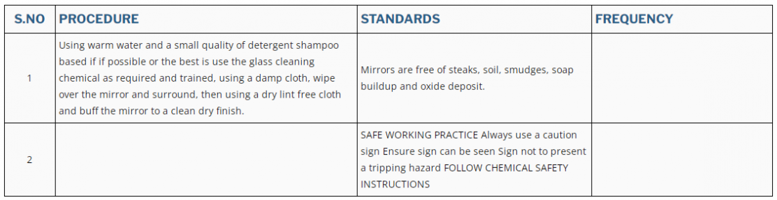 1 | Using warm water and a small quality of detergent shampoo based if if possible or the best is use the glass cleaning chemical as required and trained, using a damp cloth, wipe over the mirror and surround, then using a dry lint free cloth and buff the mirror to a clean dry finish. | Mirrors are free of steaks, soil, smudges, soap buildup and oxide deposit. | |