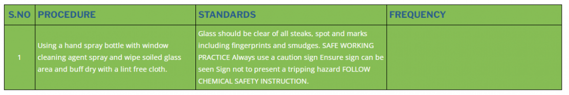 1 | Using a hand spray bottle with window cleaning agent spray and wipe soiled glass area and buff dry with a lint free cloth. | Glass should be clear of all steaks, spot and marks including fingerprints and smudges. SAFE WORKING PRACTICE Always use a caution sign Ensure sign can be seen Sign not to present a tripping hazard FOLLOW CHEMICAL SAFETY INSTRUCTION. |