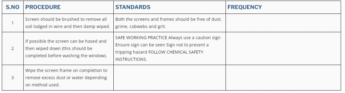 1 | Screen should be brushed to remove all soil lodged in wire and then damp wiped. | Both the screens and frames should be free of dust, grime, cobwebs and grit. | |