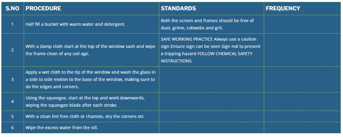 2 | If possible the screen can be hosed and then wiped down (this should be completed before washing the window). | SAFE WORKING PRACTICE Always use a caution sign Ensure sign can be seen Sign not to present a tripping hazard FOLLOW CHEMICAL SAFETY INSTRUCTIONS. | |