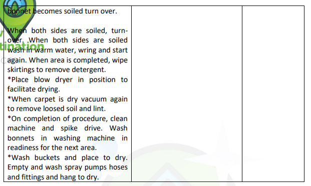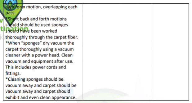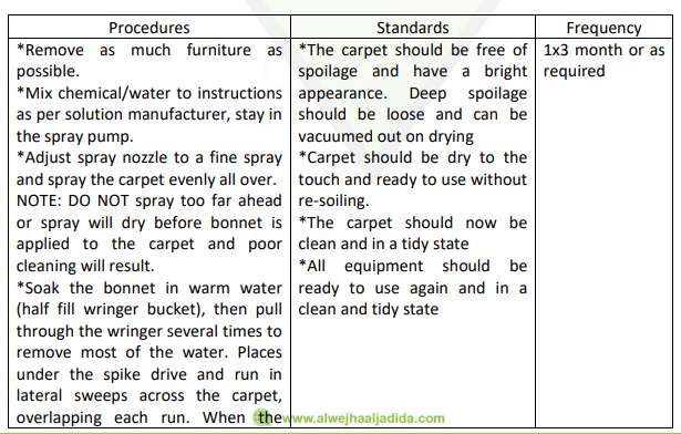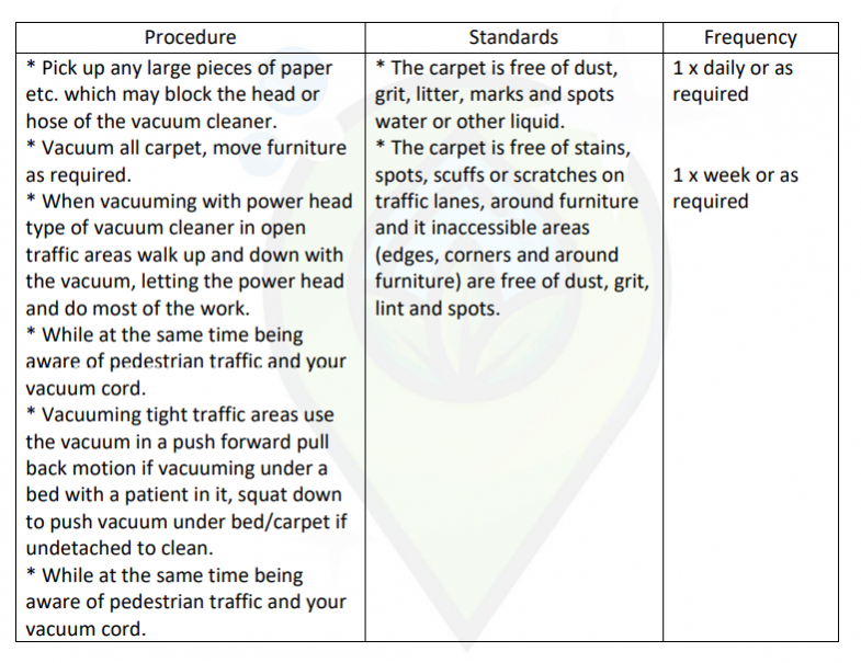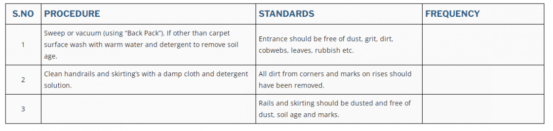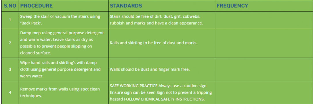 1 | Sweep the stair or vacuum the stairs using “Back Pack”. | Stairs should be free of dirt, dust, grit, cobwebs, rubbish and marks and have a clean appearance. | |