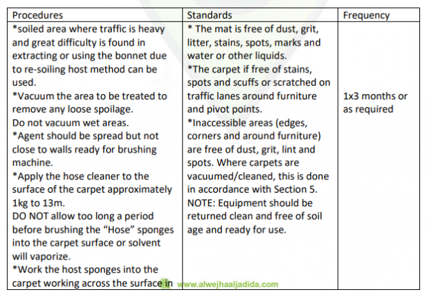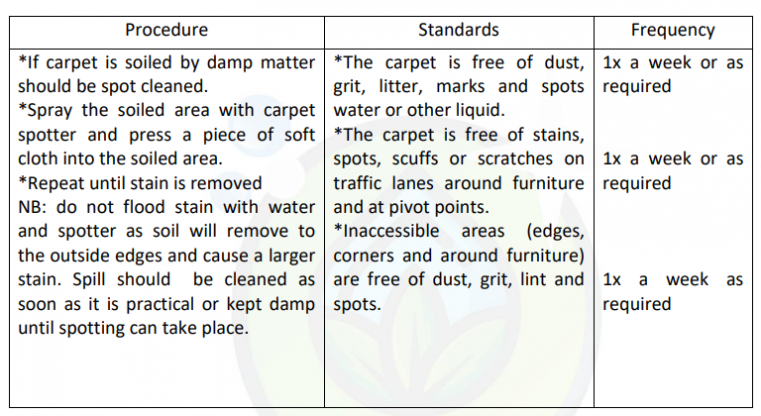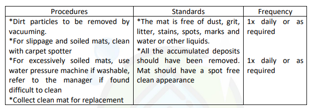 1 | Sweep or vacuum (using “Back Pack”). If other than carpet surface wash with warm water and detergent to remove soil age. | Entrance should be free of dust, grit, dirt, cobwebs, leaves, rubbish etc. | |