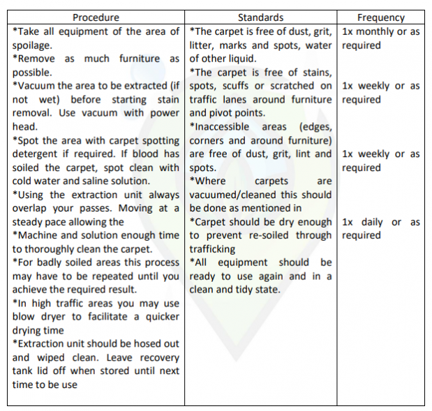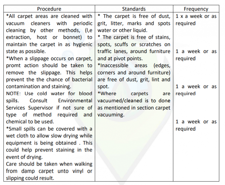 S.NO | Procedure | Standards | Frequency |
